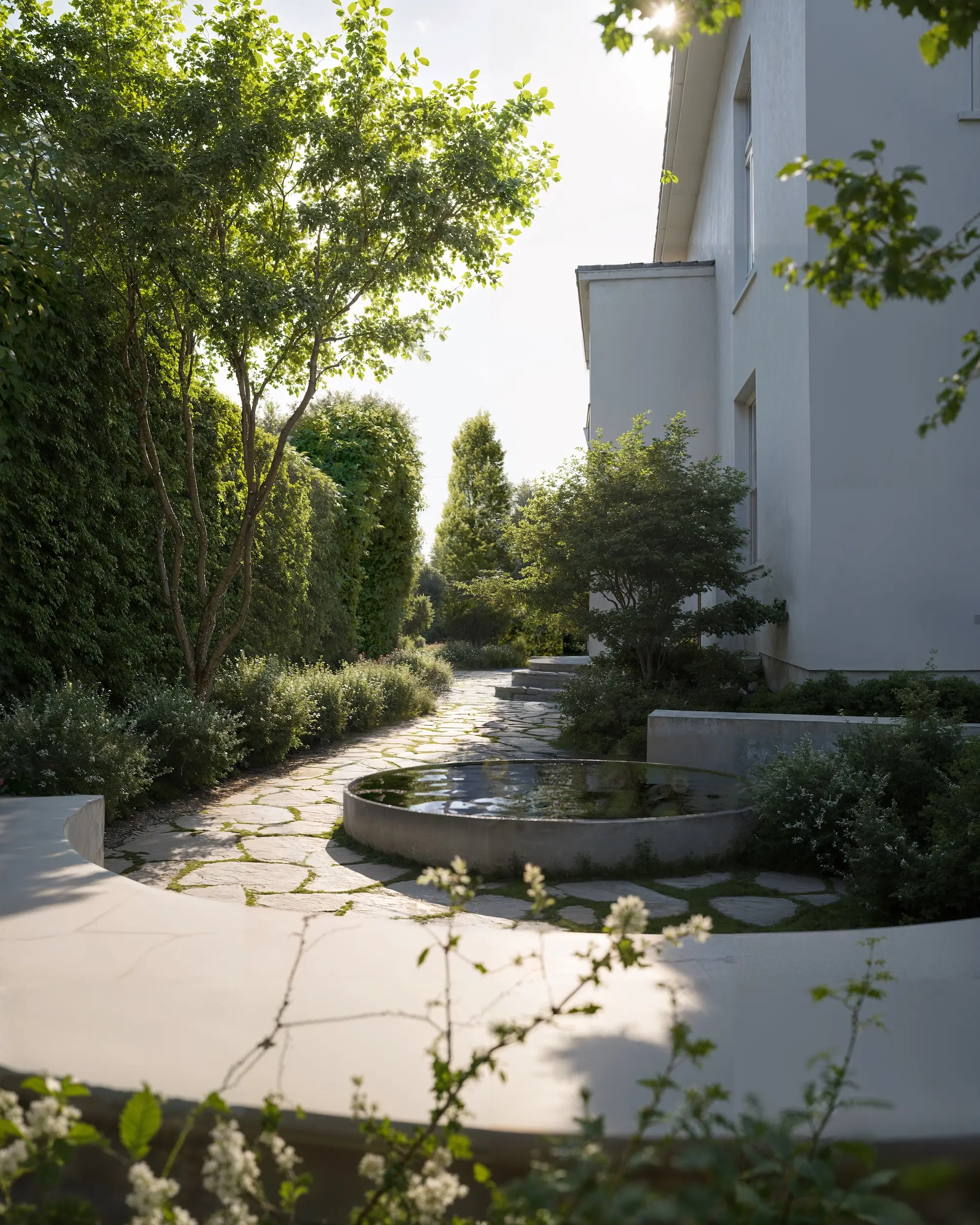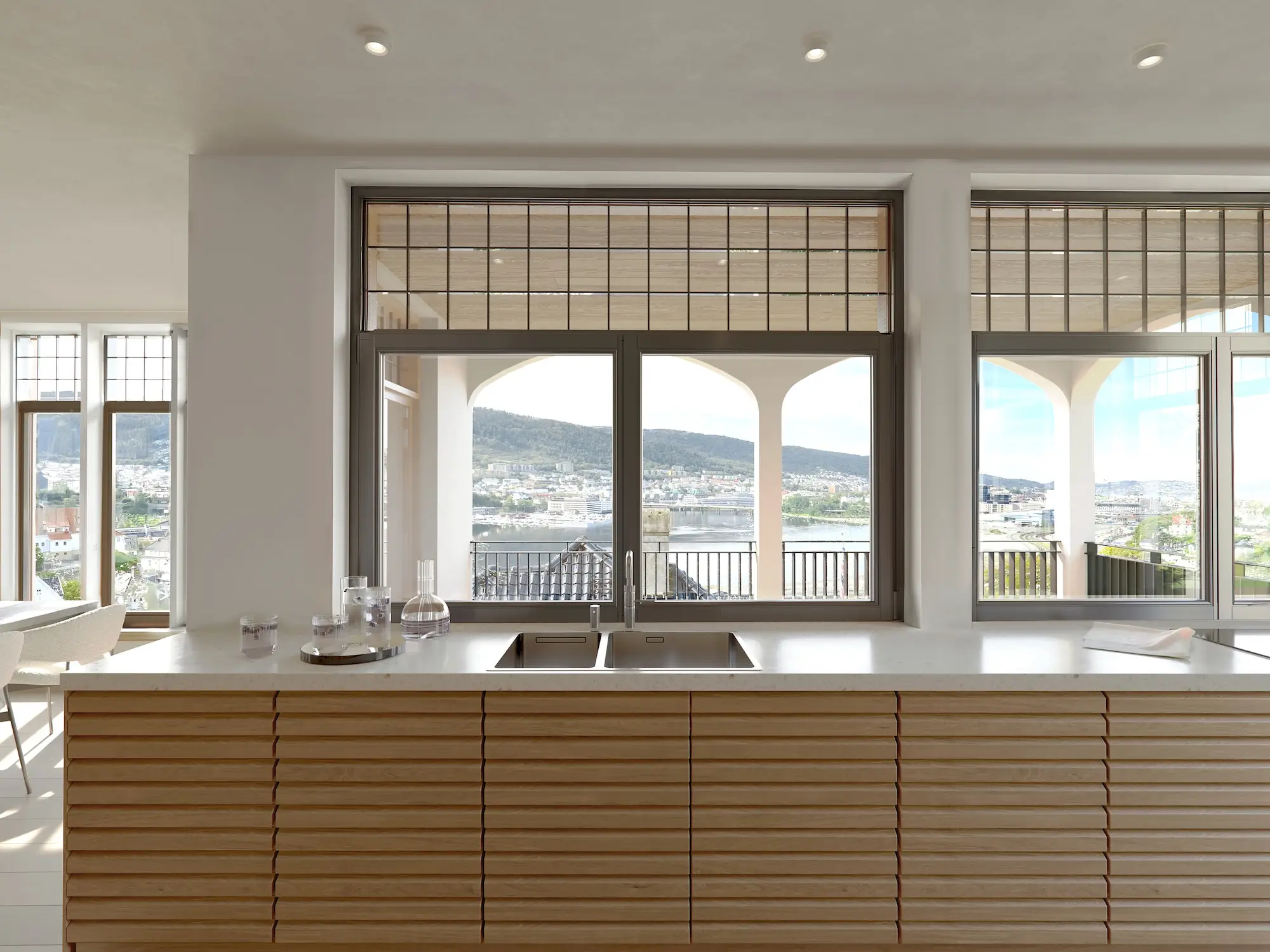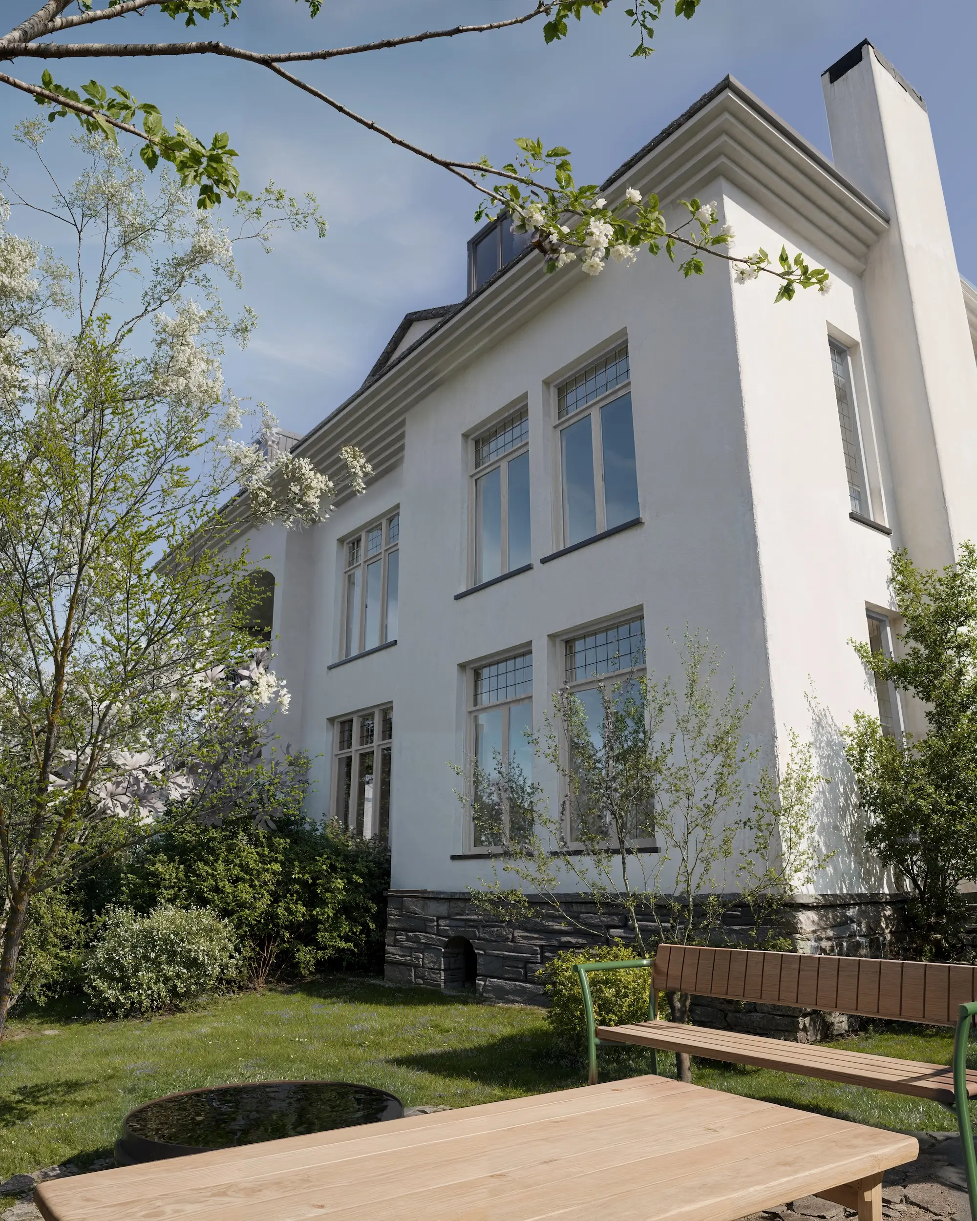 Huset har en enkelt ytre. Klassiske proporsjoner, valmtak i dråpeskifer, jugend-inspirerte vinduer tilsvarende eksiterende villa, markert gesims og en lek mellom symmetri og asymmetri gir et rolig og selvfølgelig uttrykk. Den opprinnelige inngangsdøren dannet utgangspunktet for formgivningen. Et typisk sentrert inngangsparti, med lavere gesims enn huset for øvrig, ønsker de besøkende velkommen. Prosjektet låner detaljer og formspråk fra klassisk villaarkitektur og Bergensskolen.